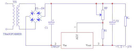 CW137为三端可调负输出集成稳压器,输出电压可调范围为-(1.2—37V),输出电流可达1.5A。其1脚为调整端,2脚为输入端,3脚为输出端。